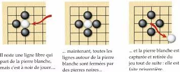 - Pour capturer une ou plusieurs pierres adverses, il faut occuper toutes ses libertés.