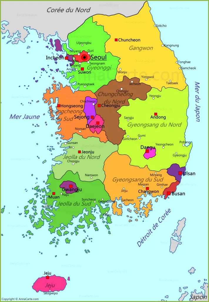 Pour rendre votre expérience sur notre site encore plus immersive, j’ai le plaisir de mettre à votre disposition une carte détaillée de la Corée. Elle vous permettra de situer précisément les villes et régions mentionnées dans les histoires que je traduis, et de mieux suivre les déplacements des personnages. N’hésitez pas à consulter cette carte à lors de vos lectures pour une immersion totale.